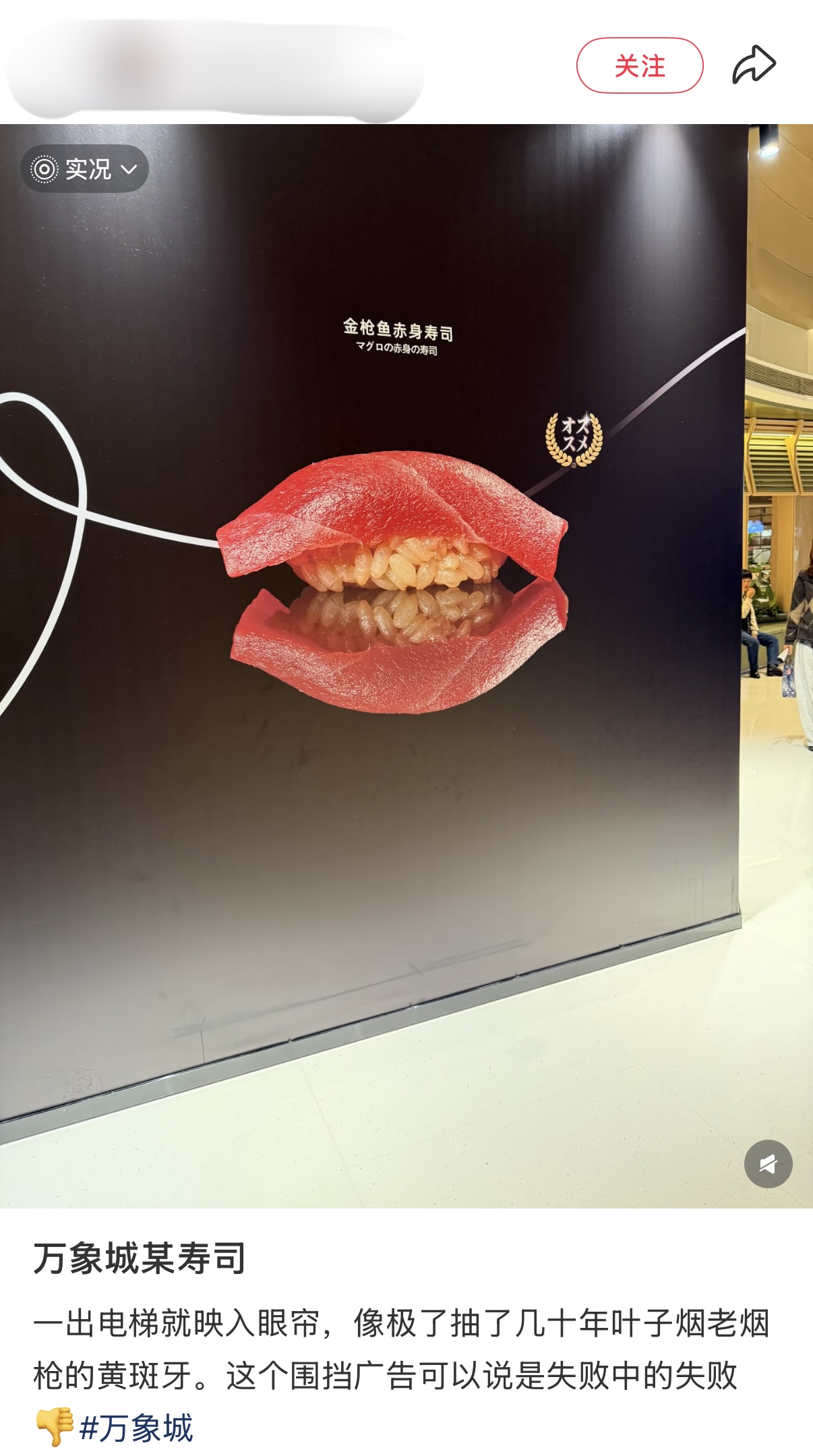 封面新闻记者姚箬君kaiyun官方网站 “一出电梯就映入眼帘,像极了抽了几十年叶子烟老烟枪的黄斑牙。”近日,成王人万象城某寿司店的围挡告白被网友发帖吐槽“倒胃口”。10月23日,记者实地走访,发现该围挡位于市场5楼,这一层楼大多是餐饮店,饭点时代,不少东谈主会途经看到这块围挡。市场计划庄重东谈主告诉记者,大部分围挡是品牌方供图,“今天还是收到顾主的反应,咱们也在与品牌方换取处分”。 本日中午,记者在现场看到,在该店铺围挡告白幕布上,印着一块“金枪鱼裸体寿司”,寿司过头倒影的神志,乍一看像一个“
